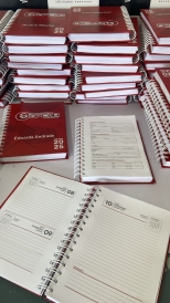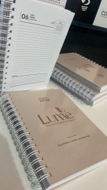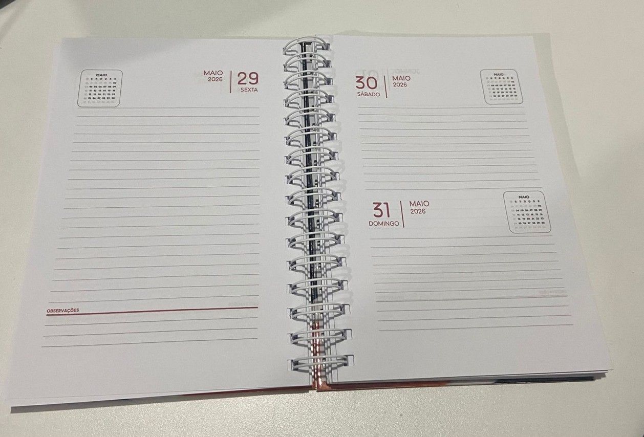Agenda Wire-o de excelente acabamento que já considera a personalização colorida na capa, contra-capa.